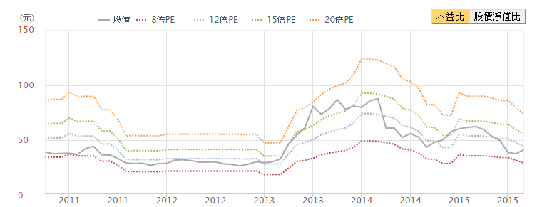 以今天收盤價 44.65 元、每股盈餘 3.82 元來算