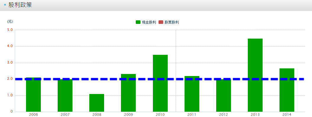 除了 2008 年金融海嘯之外,每年都配發現金股利 2 元以上!