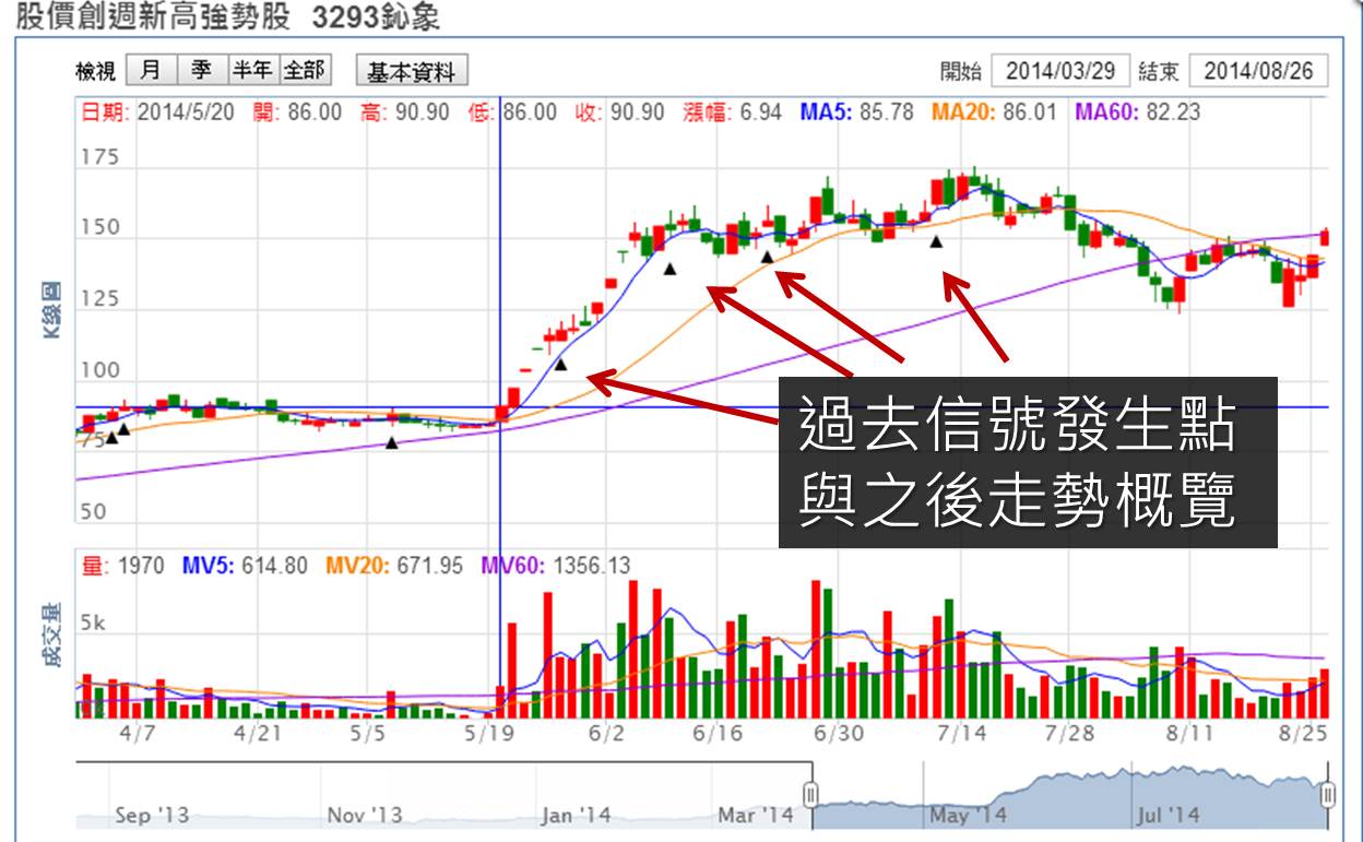 發生的「鈊象(3293)股價創週新高」信號為例 :