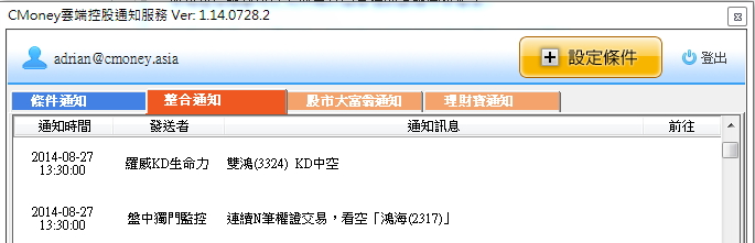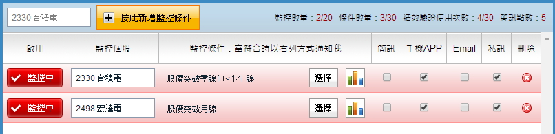 你可以在「即時訊號通知」中設定高達30組監控條件,