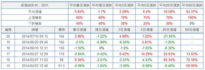 而發生訊號後的「當日」、「隔日」、「3日」、「5日」、「20日」、「60日」上漲的機會都比較大,