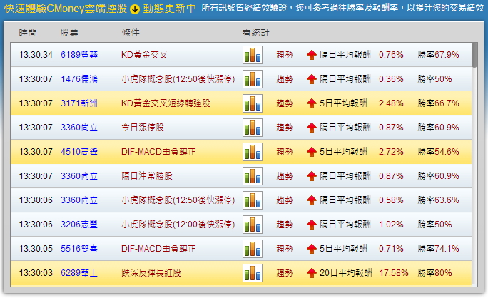 同時也可以看到這些訊號的多空方向、平均報酬率與勝率等等,