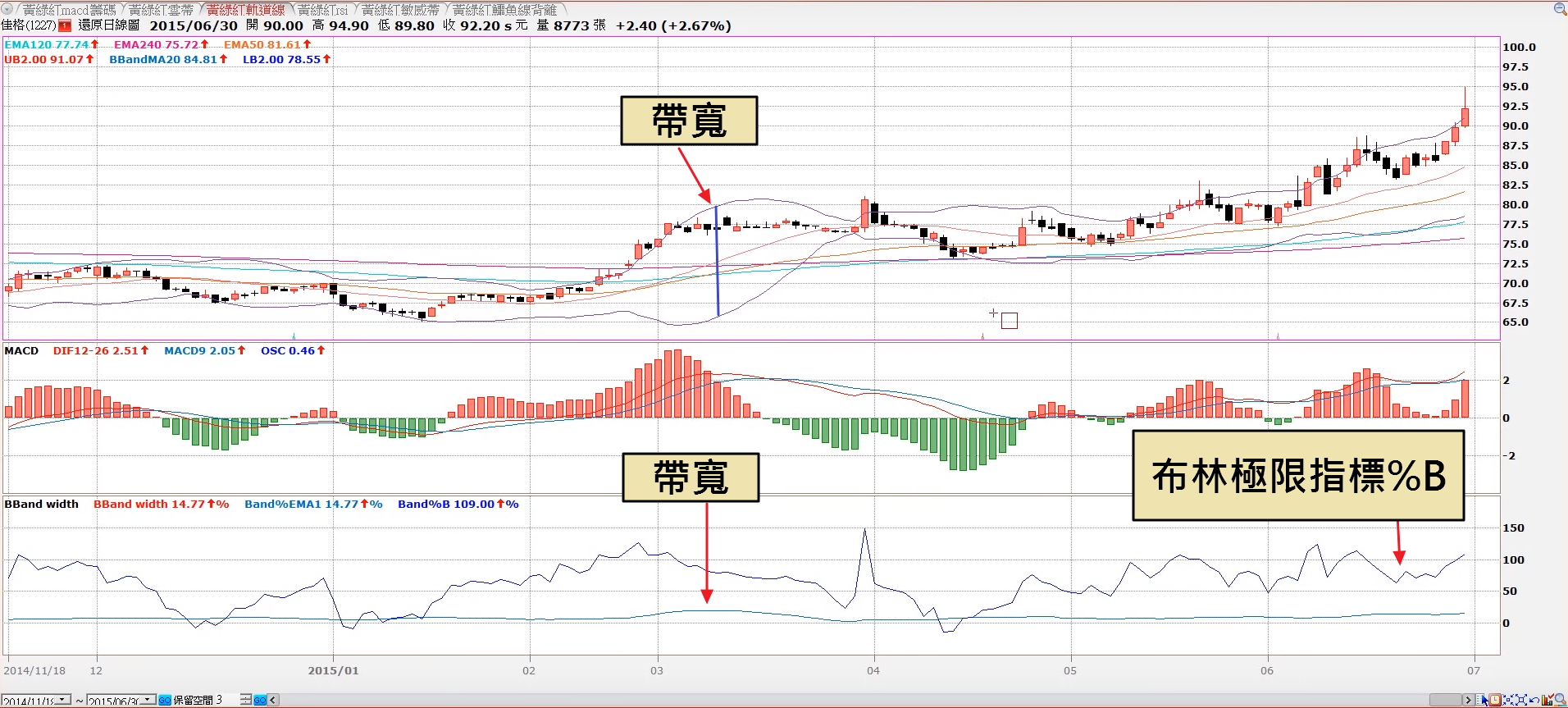 (資料來源:黃綠紅短期指標 布林軌道線之整理箱與%b)