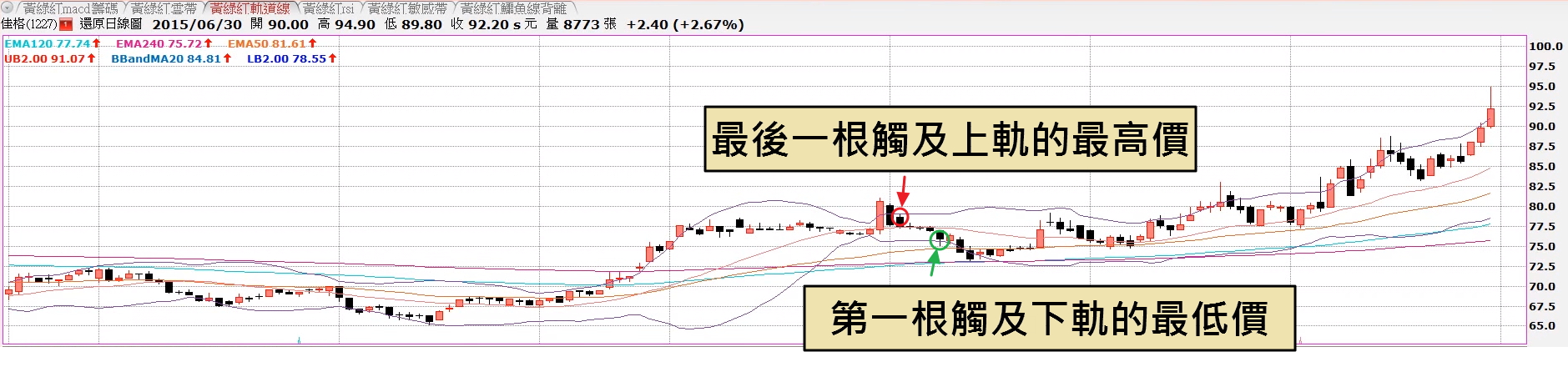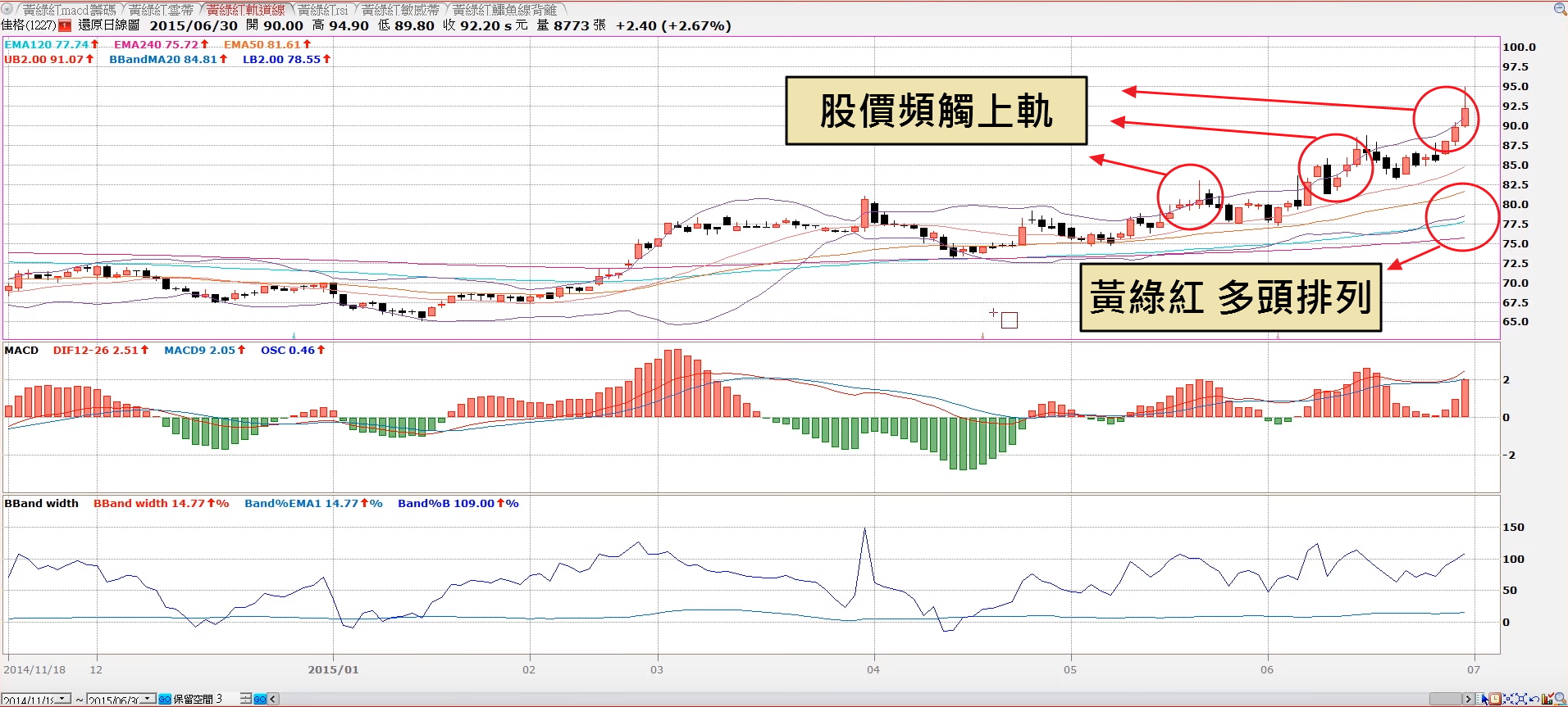 在黃綠紅多頭排列,股價創新高的特性下