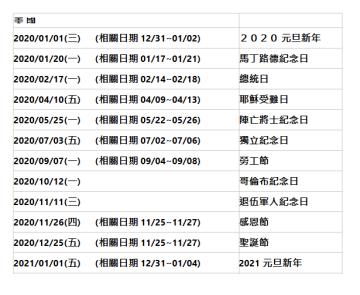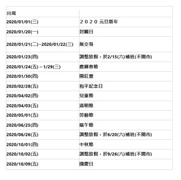 ● 2020年台灣例假日休市、補班