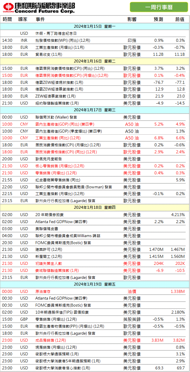 康和期貨-重要數據行事曆20240115