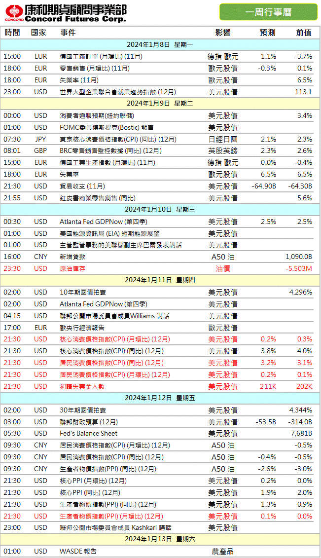 康和期貨-重要數據行事曆20240108