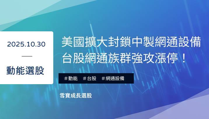 美國擴大封鎖中製網通設備,台股網通族群強攻漲停!受惠於美國聯邦通訊委員會(FCC)擴大限制中國製電信與監控設備流入美國市場,今 10/28資金大舉流入網通族群,多檔個股強勢漲停,這些個股「雪寶成長選股 APP」都抓到了! 帶大家來看看一早就被「動能機器人」策略偵測到的建漢(3062)、訊舟(3047