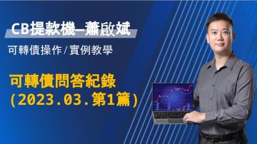 1月 2023年10 2023-1月-可轉債問答記錄影音解說版(1) 最後更新於  2023.1.10 23:54 瀏覽人次 : 431 撰文者: 蕭啟斌 標籤:CB提款機-蕭啟斌, 可轉債, 選股 收藏 2023.01.第一周影音文章前半部為說明日後影片方向及理念後半部為新發行可轉債提醒與觀察及強勢股之會陸續發布11、12月份影片,非常感謝各位的體諒!影片連結如下:升級存股不離可轉債PC(專業版),解鎖此文章再享以下好禮: 繼續閱讀...