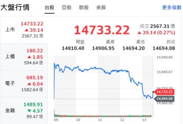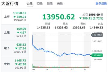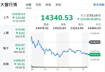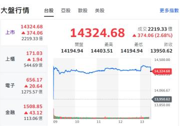 大盤今日上漲374點,加權指數收盤為14324.68點,成交金額2219.33億元