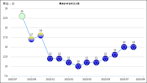 國發會在9/27號發布景氣對策信號,綜合判斷分數為15分,景氣燈號低迷不振,連續10個月藍燈。